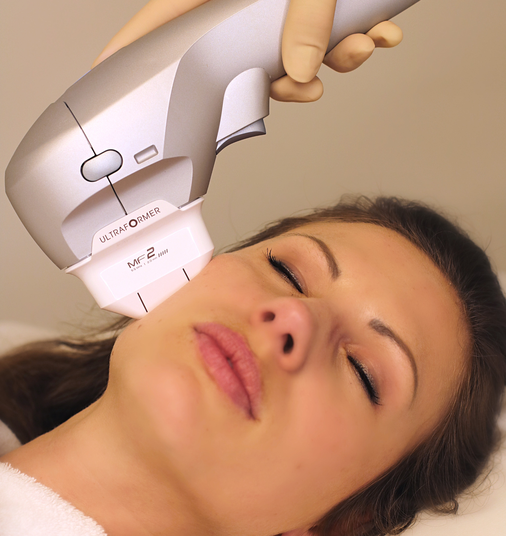 High-Intensity Focused Ultrasound treatment to tighten skin, lift facial contours, and reduce chin fat non-surgically.